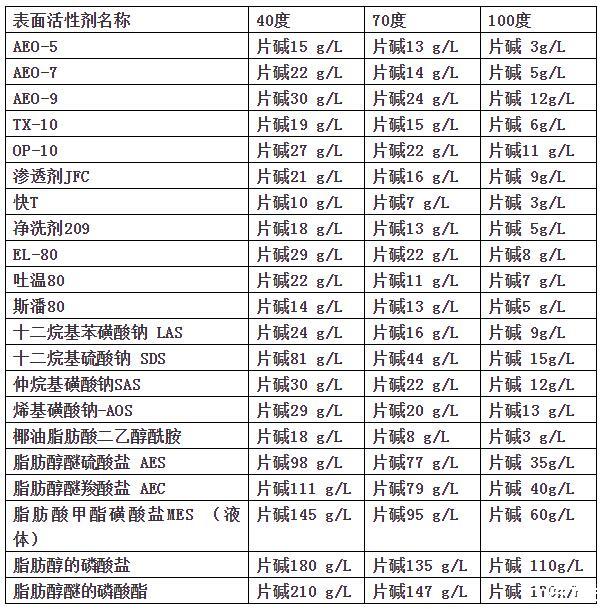 目前市場(chǎng)上常見的各種表面活性劑,包括非離子、陰離子最常用兩大類的耐堿、凈洗、除油和除蠟性能的比較。