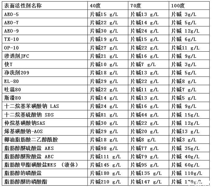 各種表面活性劑耐堿性一覽表