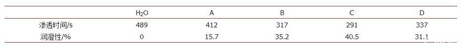 分別選用了四種抑塵劑A、B、C、D,使用正向滲透法研究了抑塵劑對于煤塵NR的潤濕能力的影響。如圖2所示,在水中加入抑塵劑可以增加在煤塵NR表面的潤濕能力,滲透時間大幅降低。四種抑塵劑的潤濕能力數據如表1所示,純水在煤塵表面4 cm的滲透時間為489 s。相比之下,抑塵劑C、B和D均能夠較大程度提高對煤塵的潤濕能力,滲透時間分別降低至291 s、317 s和337 s,潤濕能力相比純水分別提高了40.5%、35.2%和31.1%。抑塵劑A的潤濕能力相對較差,滲透相同煤塵距離所需要的時間為412 s,潤濕能力比純水僅提高了15.7%。