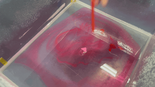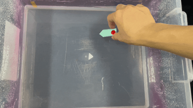 將油墨滴在小船的尾部,讓油墨一會兒能夠接觸到水面。