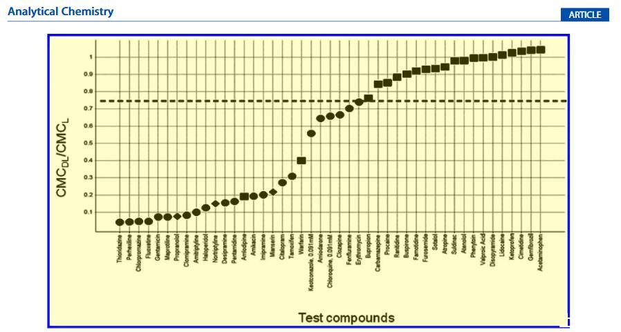 圖3.在pH 7.2的熒光測定中觀察到的CMC偏移(由藥物脂質復合物(DL)的CMC和單獨的脂質(L)的CMC之間的比率表示:CMCDL/CMCL)與體內(nèi)人體內(nèi)的比較體內(nèi)動物或體外細胞PLD分析。CMCDL/CMCL的臨界值為0.75,將PLD誘導劑(b,體內(nèi)測定;[,細胞測定)與PLD非誘導劑(9)分開,只有兩個異常值:氨氯地平和華法林。