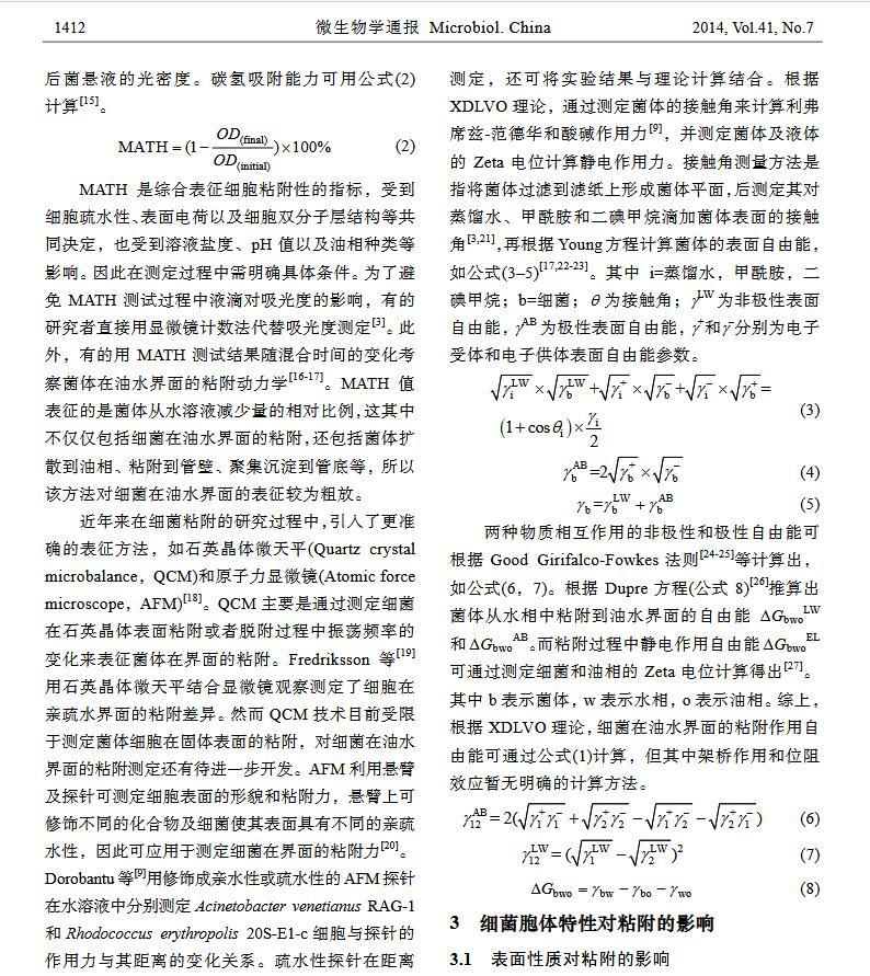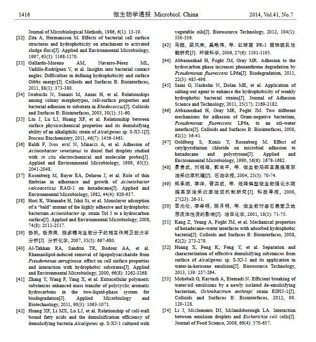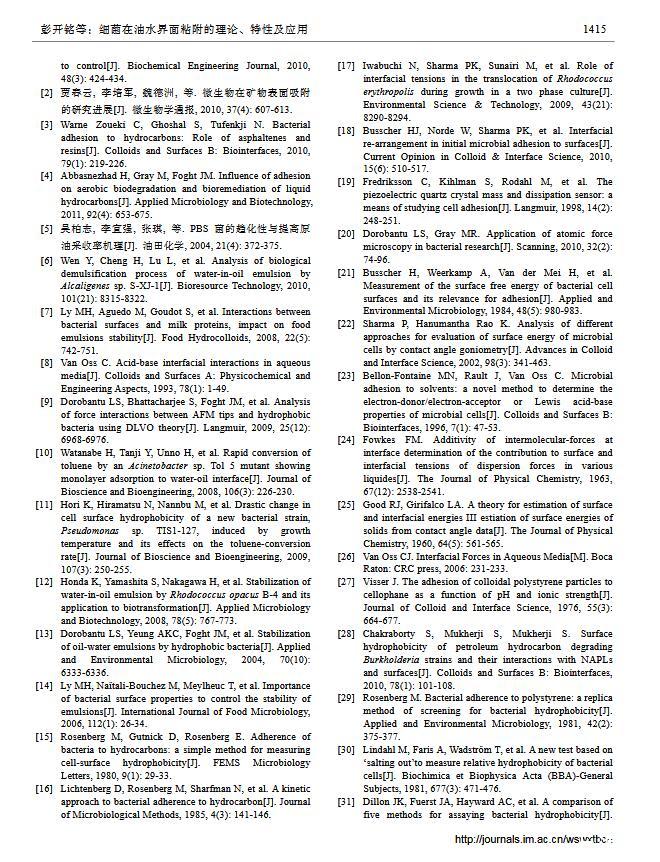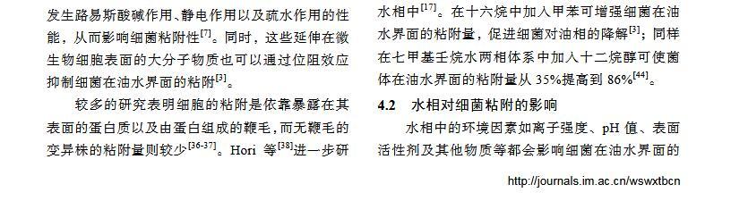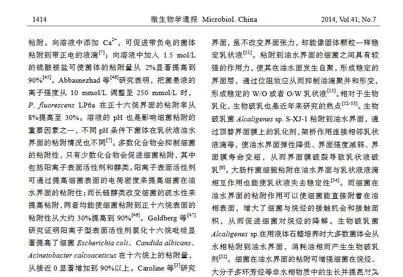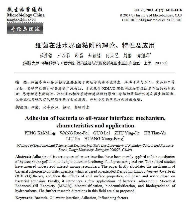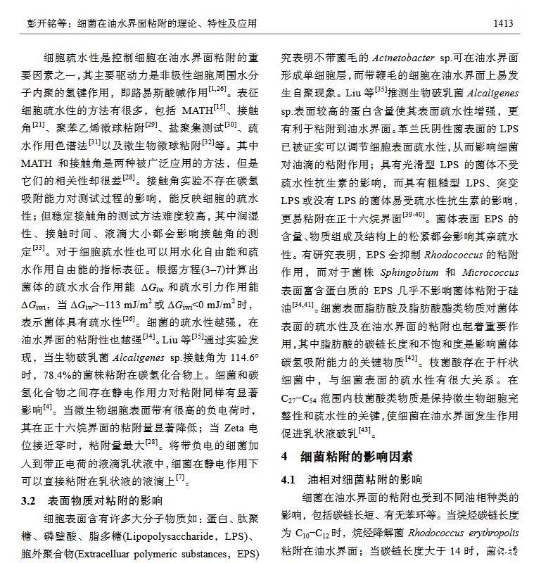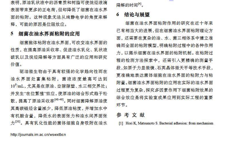 摘 要:細菌在油水界面粘附主要應(yīng)用于烷烴污染的環(huán)境修復(fù)、石油開采與加工、食品加工等方面,其研究已經(jīng)引起各界的廣泛關(guān)注。本文基于 XDLVO 理論闡述細菌在油水界面的粘附機理;總結(jié)細菌表面特性、油相及水相性質(zhì)對細菌粘附的影響;介紹細菌粘附作用在微生物驅(qū)油、生物乳化與破乳以及烷烴降解方面的應(yīng)用,并對今后的研究方向提出展望。