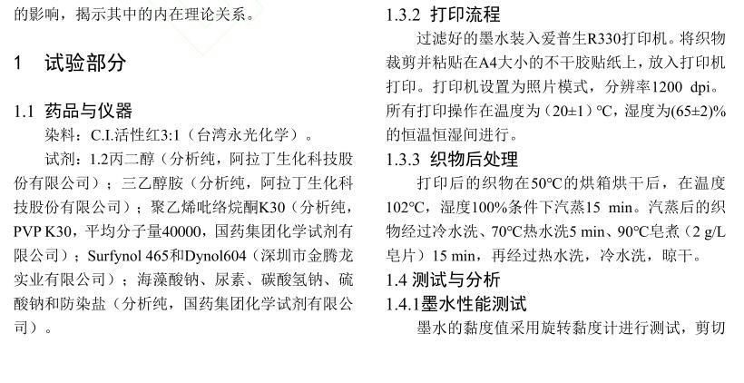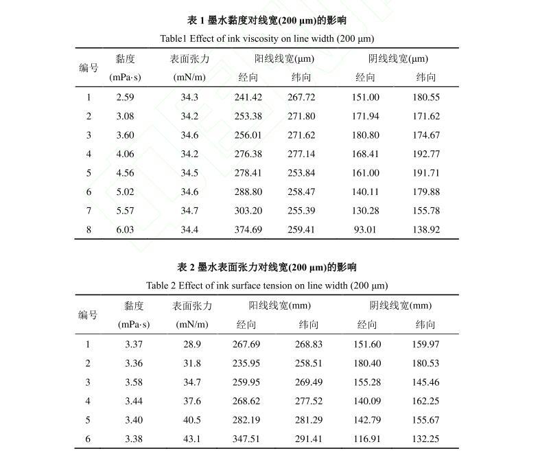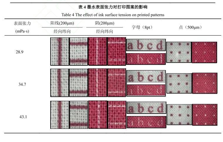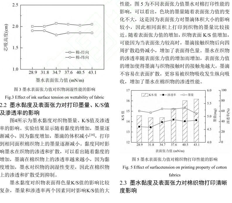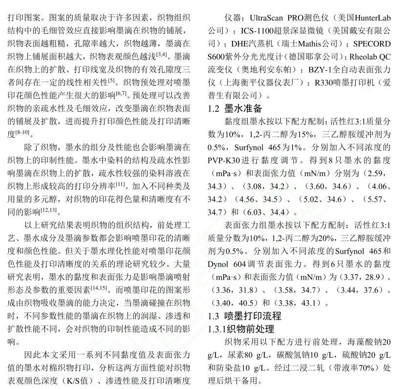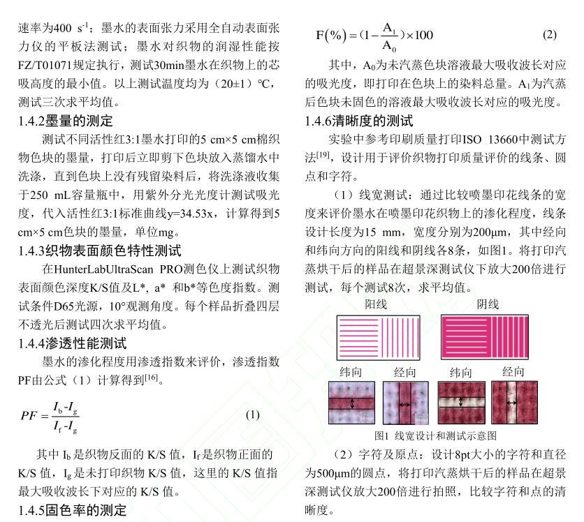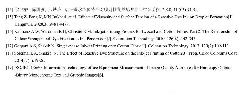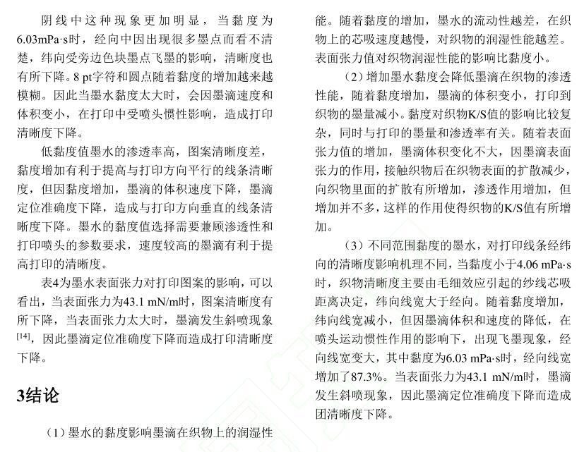 【摘要】:為了研究活性染料墨水黏度和表面張力對棉織物印花性能的影響,配制不同黏度和表面張力的活性紅墨水,測試打印后織物的滲透率、K/S值、墨量及打印線寬等指標。結果表明:提高墨水黏度會降低墨滴在織物上的潤濕和滲透性能,打印到織物的墨量減少,打印清晰度下降。不同黏度的墨水對打印線條經緯向的清晰度影響機制不同,表面張力對織物打印性能的影響比黏度小。