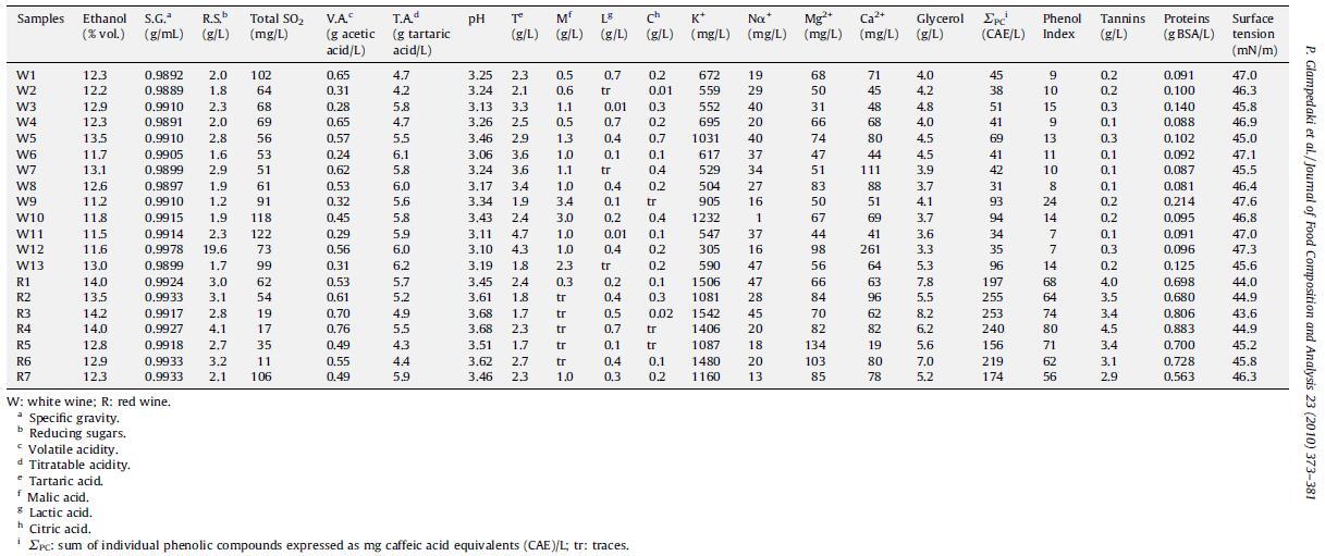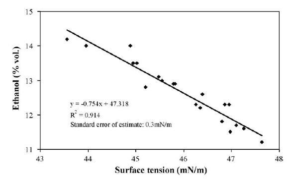 檢測(cè)到乙醇、蛋白質(zhì)和單寧對(duì)水性、水醇和模型葡萄酒標(biāo)準(zhǔn)溶液的表面張力有顯著影響,以及上述基質(zhì)之間的重要變化后,我們認(rèn)為繼續(xù)對(duì)真實(shí)葡萄酒樣品進(jìn)行研究很有趣。 我們的目標(biāo)是評(píng)估盡可能多的其他葡萄酒化合物對(duì)表面張力的影響,獲得統(tǒng)計(jì)相關(guān)性,最后,基于對(duì)葡萄酒表面張力的簡(jiǎn)單測(cè)量,獲得基本釀酒參數(shù)值的預(yù)測(cè)模型。
