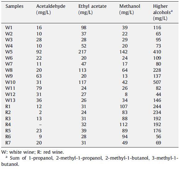 表 3 在 20 個(gè)葡萄酒樣品中測(cè)定的揮發(fā)性化合物濃度的平均值。