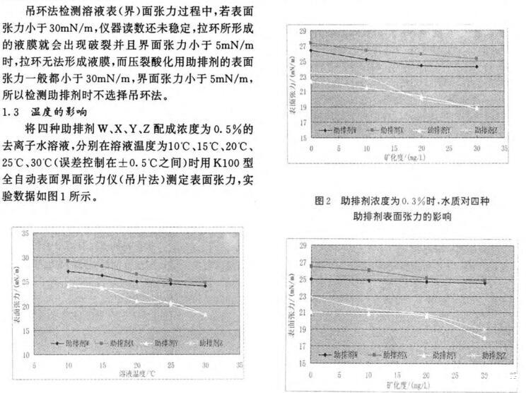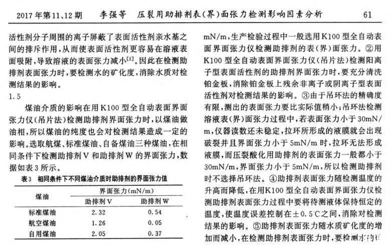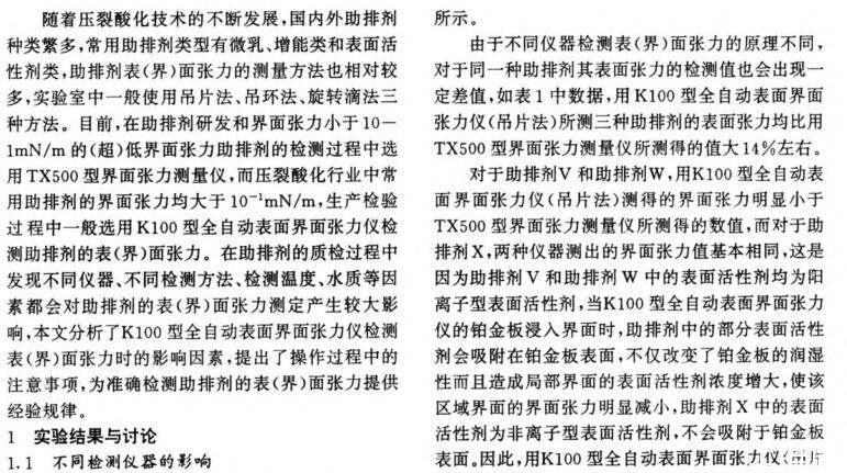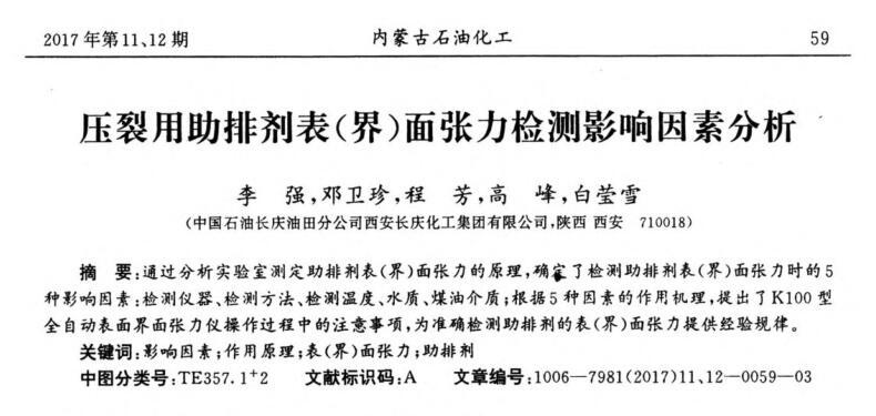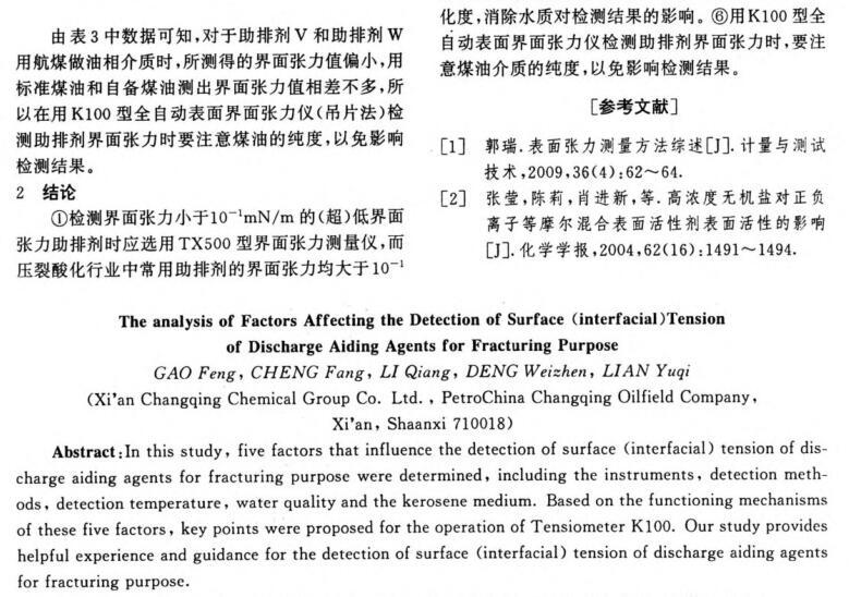 【摘要】:通過分析實驗室測定助排劑表(界)面張力的原理,確定了檢測助排劑表(界)面張力時的5種影響因素:檢測儀器、檢測方法、檢測溫度、水質、煤油介質;根據5種因素的作用機理,提出了K100型全自動表面界面張力儀操作過程中的注意事項,為準確檢測助排劑的表(界)面張力提供經驗規律。