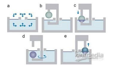 交替型LB膜分析儀的鍍膜過程如圖3所示。當使用兩個單分子層壓縮沉積池和一個空白沉積池時,可實現交替鍍膜,浸漬過程可在3個沉積池中選擇任意路徑多次循環(圖3a);在共同的亞相(淺藍色)上方,有兩種不同的單分子層(紫色和深藍色)(圖3b);上臂將樣品向下通過單分子膜,由下臂接住樣品。沉積循環也可從亞相開始,進行第一層鍍膜(圖3c);下臂可根據需要旋轉到另一單分子層的沉積池或空白沉積池中,改變沉積池(圖3d);下臂提起樣品,傳遞給上臂(樣品從任意一側通過兩個單分子層中任意一個),進行第二層鍍膜(圖3e)。