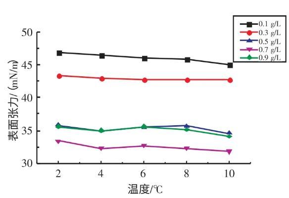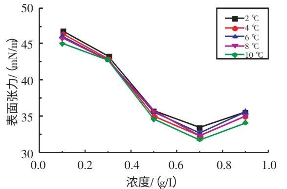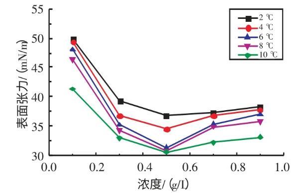 2.2.1不同溫度下十二烷基苯磺酸鈉溶液表面張力與濃度的關系實驗研究了在溫度為2、4、6、8、10℃條件下,SDBS溶液的表面張力與濃度的關系(見圖3)。由圖3可知,當濃度在0.1~0.7 g/L時,隨著SDBS溶液濃度的升高,其表面張力逐漸減小;當濃度在0.7~0.9 g/L時,隨著SDBS溶液濃度的升高,其表面張力逐漸增大。當SDBS溶液濃度為0.7 g/L時,其表面張力取得最小值。
