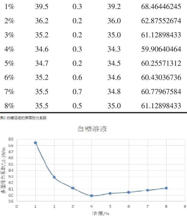 由測量數據及圖像可看出,與純水的表面張力系數(72.75×10-3N/m)相比,當加了蔗糖后,其表面張力系數均有所降低。在同一濃度下,白糖溶液的表面張力系數大于紅糖溶液的表面張力系數;對于白糖溶液,隨著濃度的增加,表面張力系數先快速減小,在4%的濃度時表面張力系數達到最小,之后又有小幅增加;對于紅糖溶液,其表面張力系數要低于白糖溶液,隨著濃度的增加,表面張力系數減小,只是在濃度較小時減小的快,濃度較大時減小的慢。