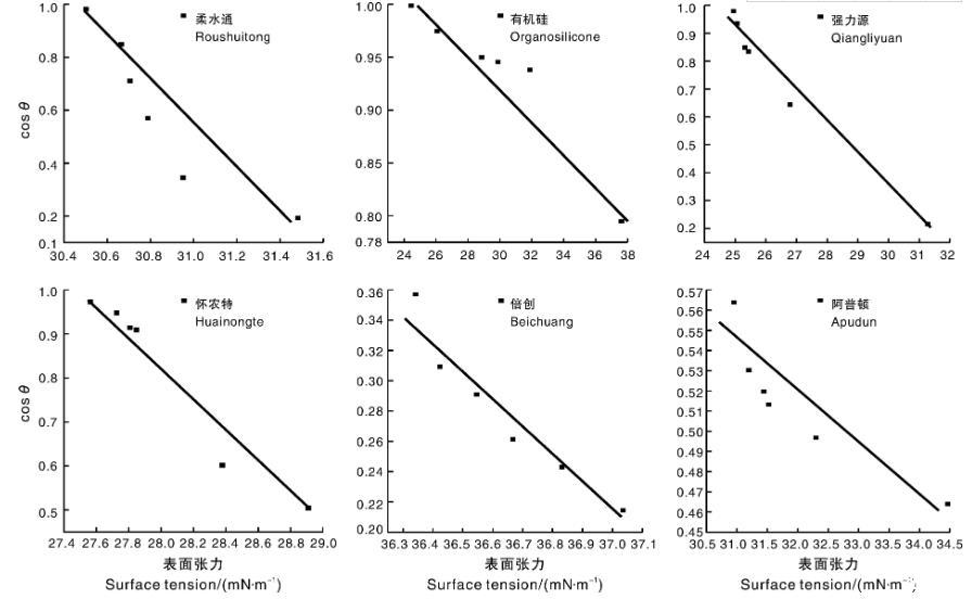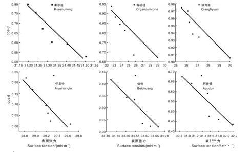吡蟲啉藥液、 阿維菌素、苦參堿表面張力與接觸角的關(guān)系