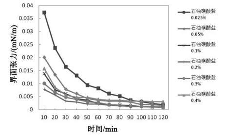 圖1不同石油磺酸鹽濃度下體系界面張力隨時(shí)間變化規(guī)律