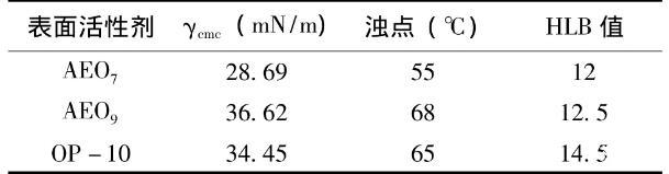 表面活性劑:脂肪醇聚氧乙烯醚AEO7(碳原子12,乙氧基數(shù)即EO數(shù)7),海安石油化工廠產(chǎn)品;脂肪醇聚氧乙烯醚AEO9(碳原子12,乙氧基數(shù)即EO數(shù)9)海安石油化工廠產(chǎn)品;辛基酚聚氧乙烯醚(OP-10,碳原子8,EO數(shù)10),廣州樂恒化工有限公司產(chǎn)品;去離子水。