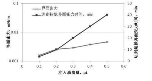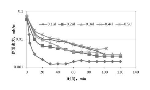 圖3、圖4是根據(jù)前述實(shí)驗(yàn)步驟1、2提供的配置與測(cè)量方法,油滴注入量分別為0.1μL、0.2μL、0.3μL、0.4μL、0.5μL,無(wú)堿二元驅(qū)配方體系與高凝油間界面張力的關(guān)系曲線。從圖2可知:無(wú)堿二元驅(qū)配方體系與高凝油間的界面張力達(dá)到超低界面張力的時(shí)間隨著油滴注入量的增多明顯延長(zhǎng),注入油滴0.1μL,4分鐘達(dá)到超低界面張力,注入油滴0.5μL,40分鐘達(dá)到超低界面張力;從圖4可知:注入油滴量大于0.3μL以后,對(duì)無(wú)堿二元驅(qū)配方體系與高凝油間界面張力的測(cè)定不能持續(xù)2小時(shí),油滴在100分鐘發(fā)生斷開,對(duì)于高凝油而言,油滴注入量小于0.3μL較適合。