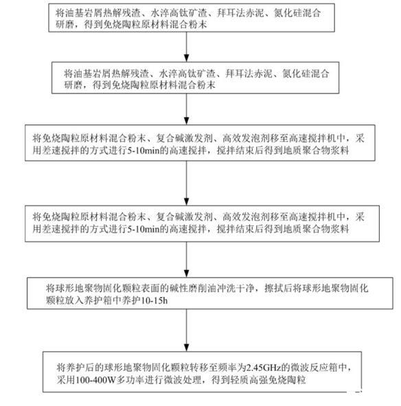 本發明提供一種油基巖屑-高鈦礦渣-赤泥基輕質高強免燒陶粒的制備方法,采用表面張力平衡法對免燒陶粒進行造粒,實現免燒陶粒的快速、便捷、高效制備,在實現便捷調控粒徑大小的效果的同時,成功獲得了圓球99-100%的免燒陶粒,并且表面張力平衡法中的介質堿性磨削油能為免燒陶粒的固化提供堿性環境,有利于加快固化速度,提高其性能。